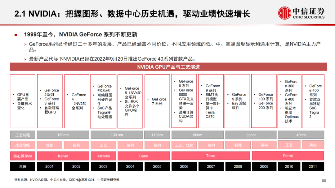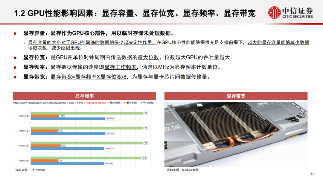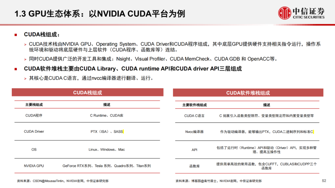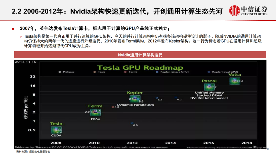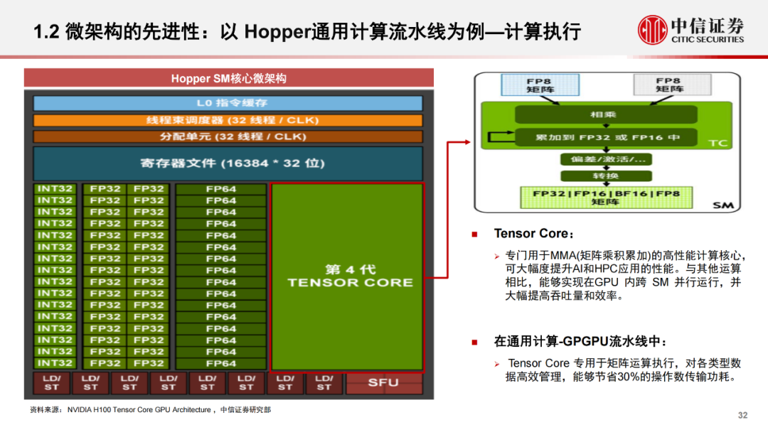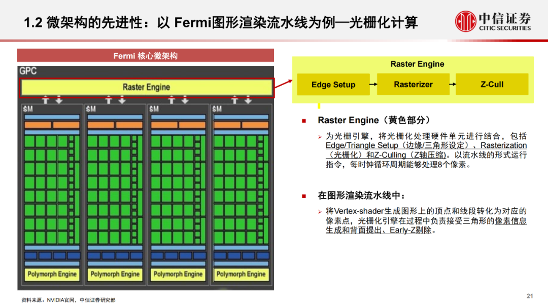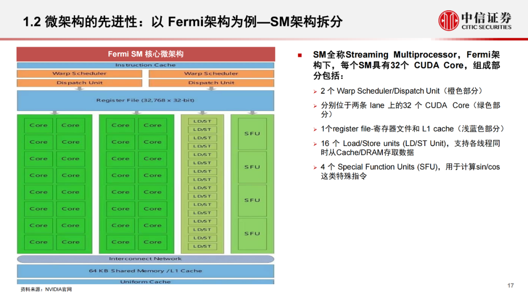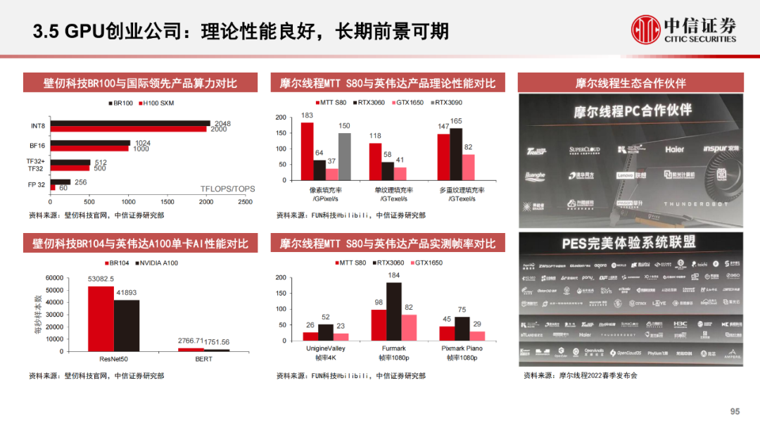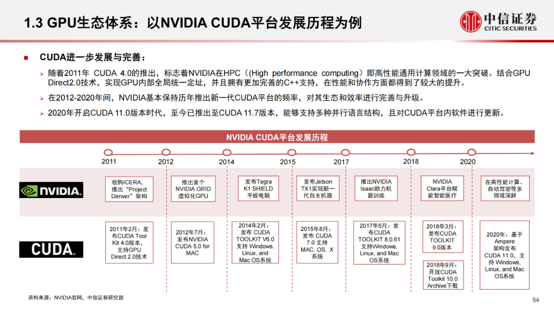 国内GPU厂商纷纷大力投入研发快速迭代架构,推动产业开放构建自主生态,加速追赶全球头部企业。国产替代需求持续释放叠加国际局势不确定性加剧,AI&数据中心、智能汽车、游戏等GPU需求有望高增,国产GPU迎来发展黄金期,我们看好国产GPU公司的发展与投资机遇。第一,我们从性能和生态2个维度构建了GPU完整的研究体系。1)性能:决定GPU是否“高效”,其中微架构/制程是影响GPU性能的核心要素。2)生态:CUDA构筑通用计算坚固壁垒。第二,提出在评估GPU性能的指标的重要性上:微架构、制程、流处理器数量、核心频率对GPU性能影响较大。我们详细梳理了GPU的微架构、制程、显存容量/位宽/带宽/频率、核心频率等各类性能参数及重要性程度,并利用“核心数*核心频率*2”公式对性能算力进行量化,揭示可用3DMark、MLPerf 等GPU软件跑分进行相关性能测试评估。第三,详细拆解了NVIDIA Fermi和Hopper两大典型微架构的具体硬件实现,在顶点处理、光栅化计算、纹理贴图、像素处理的图形渲染流水线上对Fermi架构进行了拆分;在指令接收、调度、分配、计算执行的通用计算流水线上对Hopper架构进行了简单易懂的描述,并指明更多、更专、更智能等未来架构升级迭代的方向。第四,明晰了生态是构建通用计算壁垒的基石。提出GPU研发难度在图形渲染硬件和通用计算软件生态层面,在IP、软件栈方面研发门槛较高,需要较长的积累,先发者优势明显。CUDA生态从2006年推出至今,经过不断发展完善,几乎已在行业生态内处于垄断地位。第五,深度复盘Nvidia/AMD(ATI)的产品迭代和竞争发展史,通过对NVIDIA长期保持领先和AMD(ATI)反超进行总结得出结论:架构创新升级和新兴领域前瞻探索是领跑GPU行业的关键。 第六,梳理和测算了国内GPU在AI&数据中心、智能汽车、游戏行业的市场空间和发展趋势。