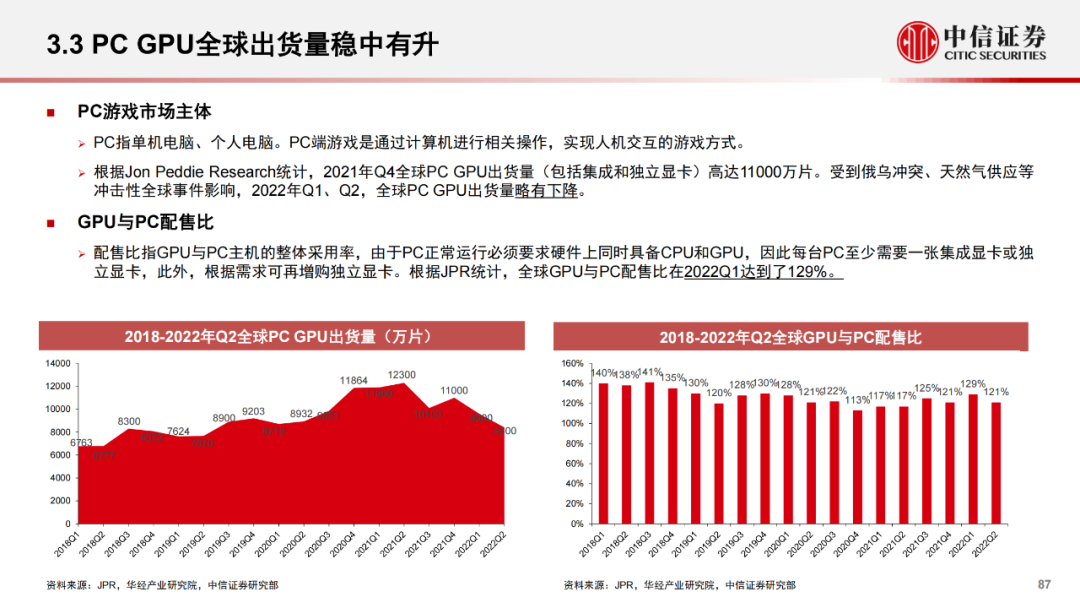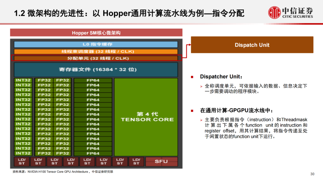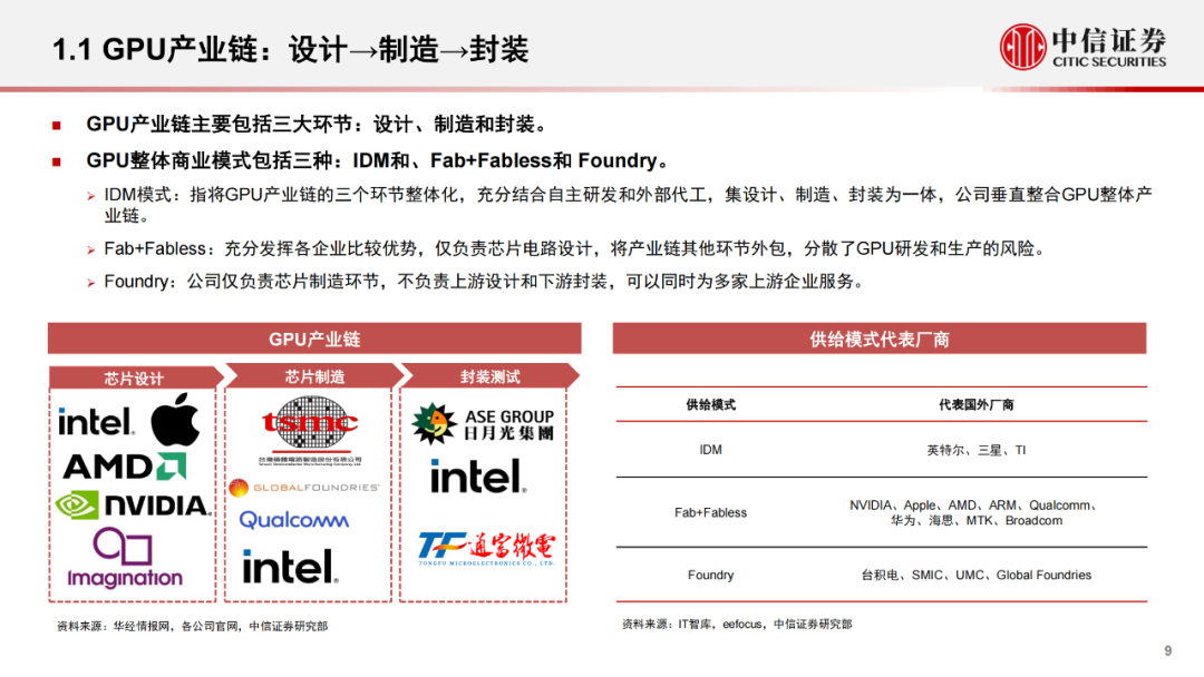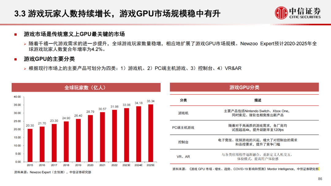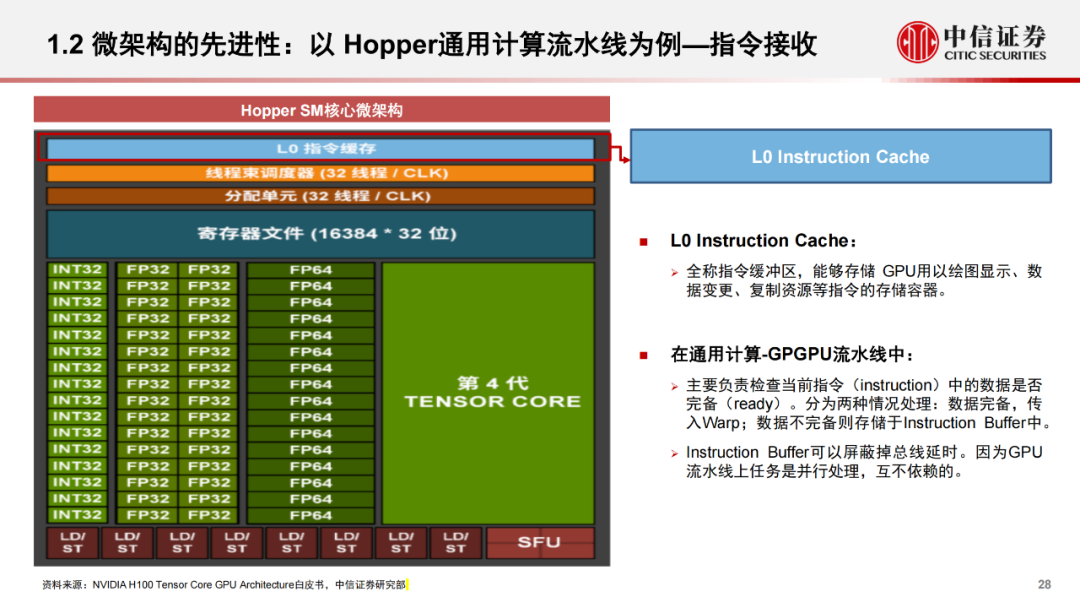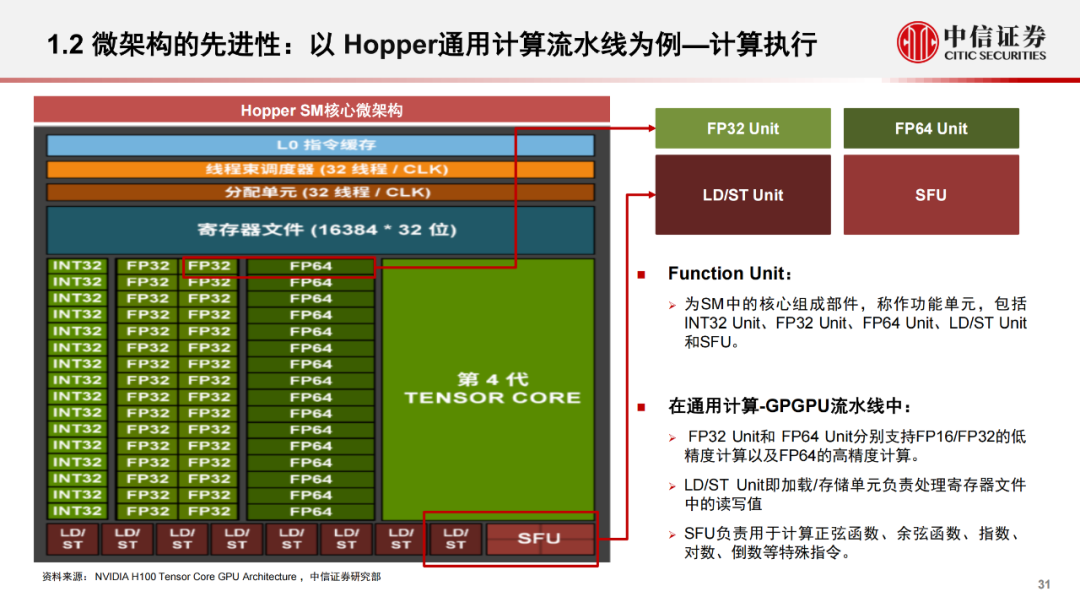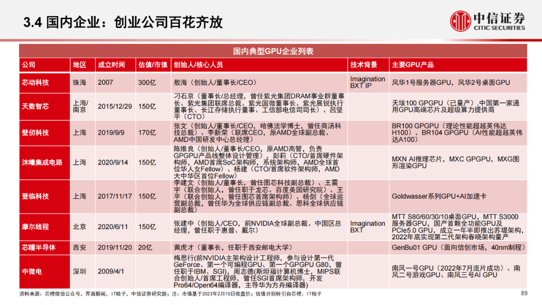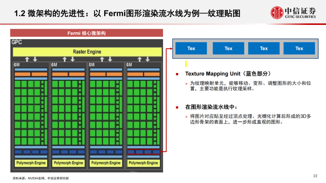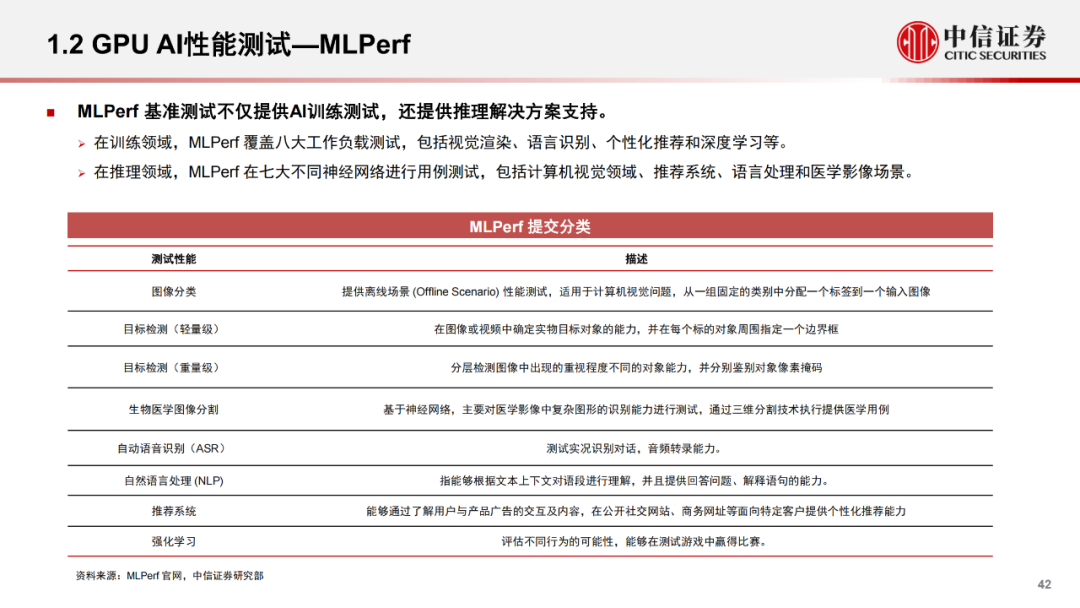 国内GPU厂商纷纷大力投入研发快速迭代架构,推动产业开放构建自主生态,加速追赶全球头部企业。国产替代需求持续释放叠加国际局势不确定性加剧,AI&数据中心、智能汽车、游戏等GPU需求有望高增,国产GPU迎来发展黄金期,我们看好国产GPU公司的发展与投资机遇。第一,我们从性能和生态2个维度构建了GPU完整的研究体系。1)性能:决定GPU是否“高效”,其中微架构/制程是影响GPU性能的核心要素。2)生态:CUDA构筑通用计算坚固壁垒。第二,提出在评估GPU性能的指标的重要性上:微架构、制程、流处理器数量、核心频率对GPU性能影响较大。我们详细梳理了GPU的微架构、制程、显存容量/位宽/带宽/频率、核心频率等各类性能参数及重要性程度,并利用“核心数*核心频率*2”公式对性能算力进行量化,揭示可用3DMark、MLPerf 等GPU软件跑分进行相关性能测试评估。第三,详细拆解了NVIDIA Fermi和Hopper两大典型微架构的具体硬件实现,在顶点处理、光栅化计算、纹理贴图、像素处理的图形渲染流水线上对Fermi架构进行了拆分;在指令接收、调度、分配、计算执行的通用计算流水线上对Hopper架构进行了简单易懂的描述,并指明更多、更专、更智能等未来架构升级迭代的方向。第四,明晰了生态是构建通用计算壁垒的基石。提出GPU研发难度在图形渲染硬件和通用计算软件生态层面,在IP、软件栈方面研发门槛较高,需要较长的积累,先发者优势明显。CUDA生态从2006年推出至今,经过不断发展完善,几乎已在行业生态内处于垄断地位。第五,深度复盘Nvidia/AMD(ATI)的产品迭代和竞争发展史,通过对NVIDIA长期保持领先和AMD(ATI)反超进行总结得出结论:架构创新升级和新兴领域前瞻探索是领跑GPU行业的关键。 第六,梳理和测算了国内GPU在AI&数据中心、智能汽车、游戏行业的市场空间和发展趋势。