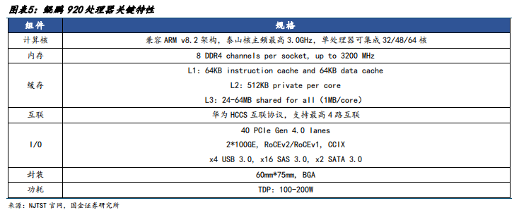 鲲鹏920处理器。该芯片支持 ARMv8.2 指令集,是行业内首款 7nm数据中心 ARM 处理器,专为大数据处理以及分布式存储等应用而设计。鲲鹏 920 采用多发射、乱序执行、优化分支预测等多种手段提升单核性能。鲲鹏920 拥有 64 个内核,集成 8 通道 DDR4,可以提供多个接口,主频可达 2.6GHz,总内存带宽最高可达 1.5Tb/s,支持 PCIe 4.0 及 CCIX 接口,总带宽 640Gbps。华为 Cache一致性总线(HCCS)的 480Gbps 片间互联支持最多四颗鲲鹏 920 互联和最高 256 个物理核的 NUMA 架构,保证了鲲鹏 920 超强算力的高效输出。此外,在 Memory 子系统上也进行了大量的优化,采用当前典型的 3 级 Cache 的架构,对 Cache 大小以及延时进行了优化设计。