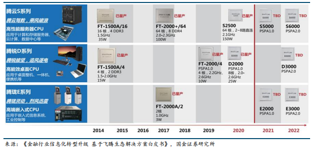 飞腾对高性能服务器 CPU、高效能桌面 CPU、高端嵌入式 CPU 三条产业线进行了全面的品牌升级。高性能服务器CPU产品线统一以飞腾腾云S系列进行命名,高性能桌面 CPU 产品线以飞腾腾锐 D 系列进行命名,高端嵌入式 CPU 产品线统一以飞腾腾珑 E 系列进行命名,提供定制化、契合各行各业嵌入式应用的解决方案。