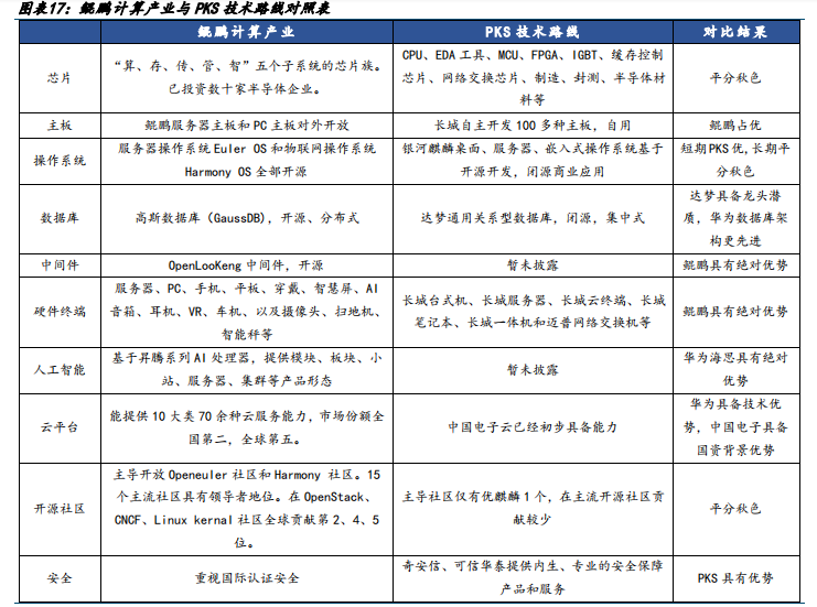 海光信息和兆芯采用 x86 架构 IP 内核授权模式,可基于公版 CPU 核进行优化或修改,优点是性能起点高、生态壁垒低,缺点是需要支付授权费、自主创新程度较低。海光最新一代 CPU 已接近国际同类高端产品水平,并兼容x86 指令集。鲲鹏和天津飞腾采用 ARM 指令集架构授权,可自行设计 CPU 内核和 SOC,也可扩充指令集,自主化程度相对较高。华为鲲鹏 920 处理器是业内首款 7nm 数据中心 ARM 处理器,非 X86 架构芯片中鲲鹏 920 芯片在算力维度方面优势领先,且发展至今已经达到可以与 X86 芯片相匹配的性能。龙芯中科采用自研的 LoongArch 指令集,拥有较强的自主性和可靠性,其秉承独立自主和开放合作的运营模式,从指令集/IP 核授权、到芯片级/主板级开发以及系统内核应用等方面对生态伙伴进行全方位的开放支持。