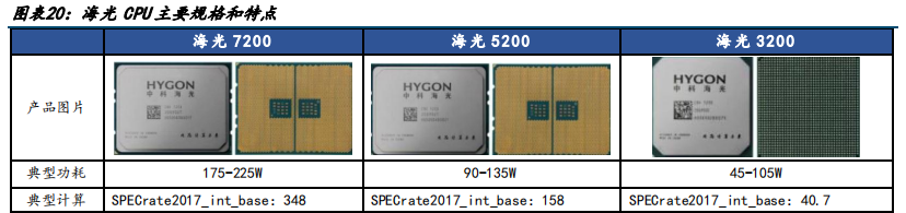 基于 AMD Zen1 架构,产品性能起点较高。选取 Intel 在 2020 年(与海光7285 同期)发布的 6 款至强铂金系列产品(能够反映 Intel 2020 年发布的主流 CPU产品的性能)与海光 7285 进行性能对比可以发现,在典型场景下,公司最新一代 CPU相关产品均已接近国际同类高端产品水平。