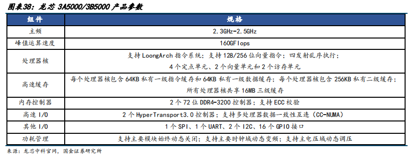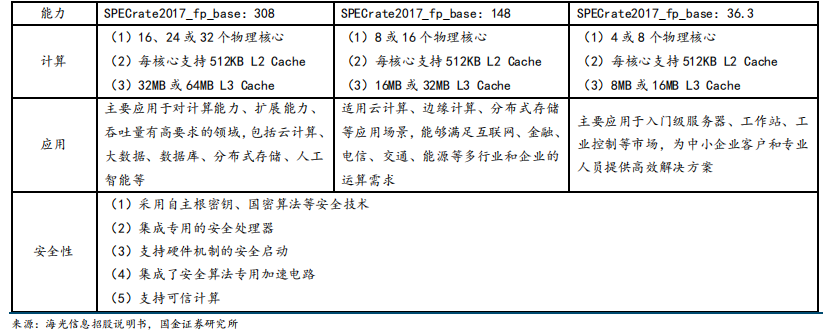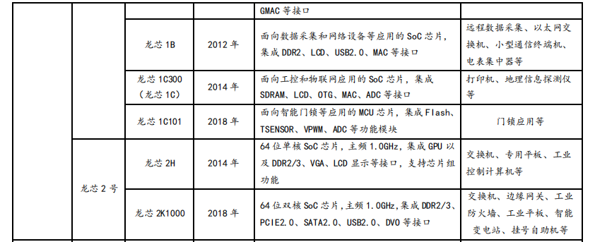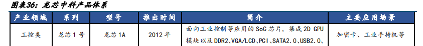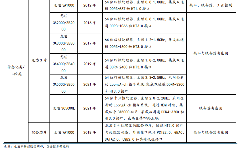 龙芯中科采用自主LoongISA 指令系统,兼容 MIPS 指令,所有 IP 模块皆为自主设计,拥有片内安全机制,可信性高。龙芯处理器以 32 位核 64 位单核及多核 CPU/SOC 为主,主要面向高端嵌入式、个人电脑、服务器和高性能机等应用。2002 年 8 月诞生的“龙芯一号”是我国首枚拥有自主知识产权的通用高性能微处理芯片。龙芯 1 号系列为低功耗、低成本的专用嵌入式 SoC 或MCU 处理器;龙芯 2 号系列为低功耗通用处理器,采用单芯片 SoC 设计,应用场景面向工业控制与终端等领域;龙芯 3 号系列为高性能通用处理器,通常集成 4 个及以上 64 位高性能处理器核,与桥片配套使用,应用场景面向桌面和服务器等信息化领域,对标 Intel的酷睿/至强系列。