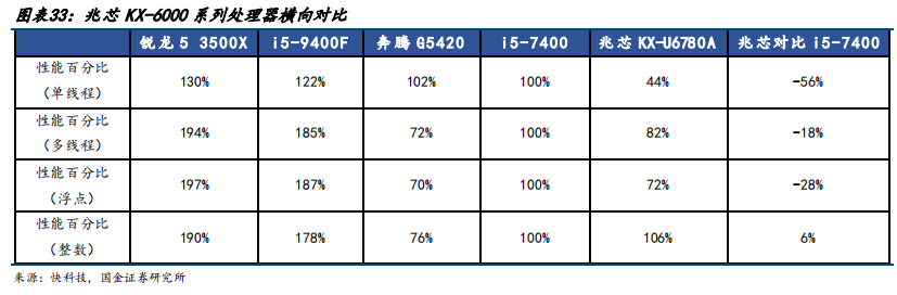 开先 KX-6000/开胜 KH-30000 系列处理器是业内第一款完整集成 CPU、GPU、芯片组的SoC 单芯片国产通用处理器,这为整机系统的开发提供了较大的便利条件,同时也更利于控制成本。通过 KX-6000 系列处理器横向对比,8 核心的 KX-U6780A 产品性能与第七代的 4 核心英特尔 i5 整体水平仍存在差距,尤其是单核性能不足 7 代 i5 一半,但整数性能方面对英特尔 i5 实现了反超。