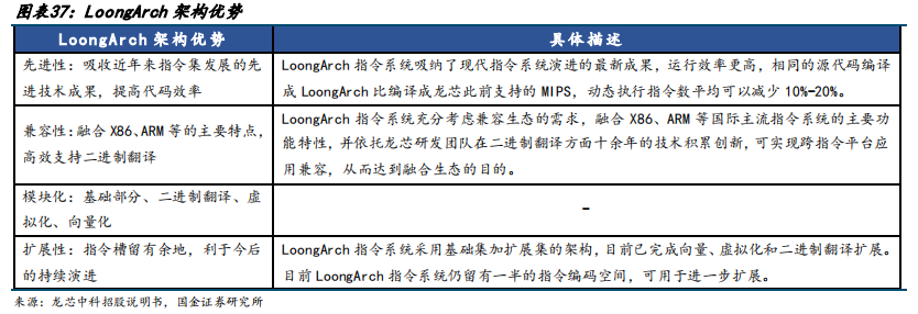 LoongArch 具有较强的扩展性和自主性。LoongArch 包括基础架构部分和向量指令、虚拟化、二进制翻译等扩展部分近 2000 条指令,具有较好的扩展性。自主性方面,LoongArch 指令系统从整个架构的顶层规划,到各部分的功能定义,再到每条指令的编码、名称、含义,都进行了自主设计,具有充分的自主可靠性。
