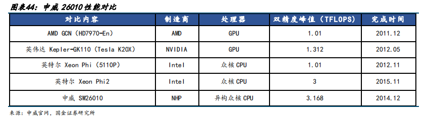 申威 26010 处理器的峰值性能大于每秒 12.5 万万亿次浮点运算结果,峰值速度、持续性能、性能功耗比排在世界前列。2016 年,搭载了 40960 颗申威 SW26010 并运行国产操作系统神威睿思的神威太湖之光获得全球超级计算机第一名,神威太湖之光峰值计算速度达每秒 12.54 亿亿次,是全球首台峰值计算速度超过十亿亿次的超级计算机,持续性能为每秒 9.3 亿亿次,软件硬件并行,均为申威自主设计。