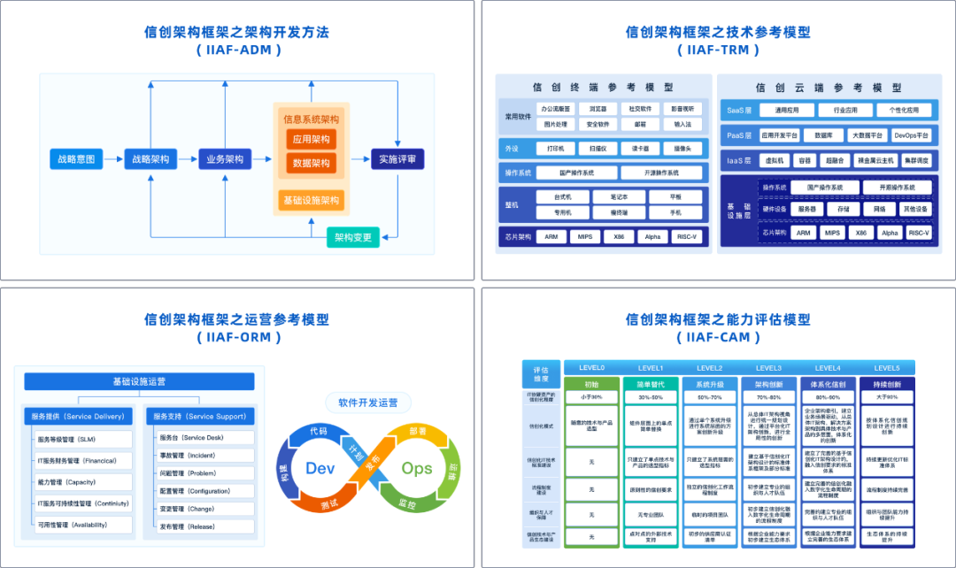央国企信创需要总体架构框架的指导,信创架构框架(Information Technology Innovation Architecture Framework:IIAF)可以为信创工作提供方法论指导,包括做什么、怎么做、以及如何处理各要素之间的关系。信创架构框架主要包括架构开发方法、技术参考模型、运营参考模型和能力评估模式四大部分内容。