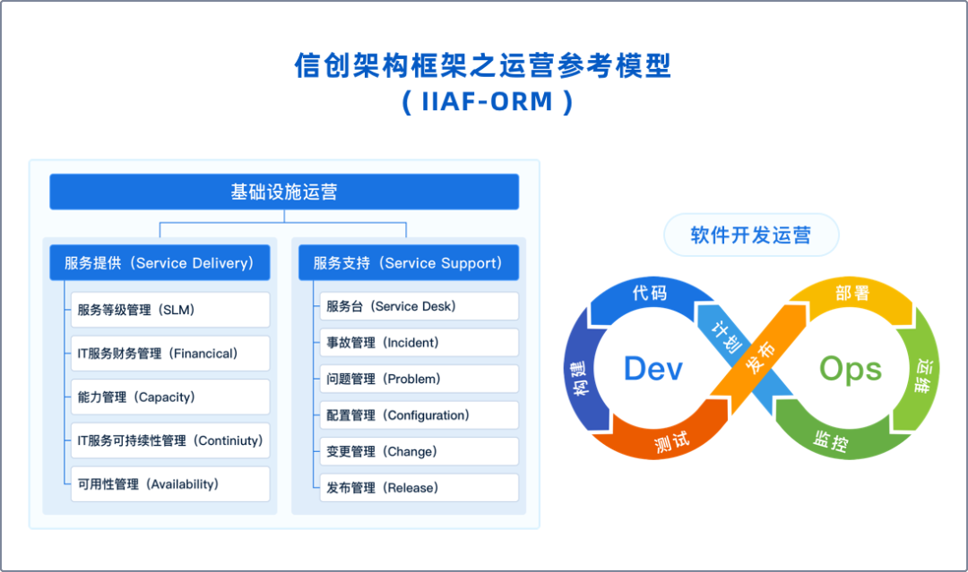 在信创工作中,由于软硬件产品的不成熟,更需要一套完善的运营体系来保证快速地解决问题。基础设施运营参考模型可以参考国际上的 ITIL 模型。ITIL本身起源于基础设施的运营维护管理,它主要分为服务交付和服务支持两大部分。