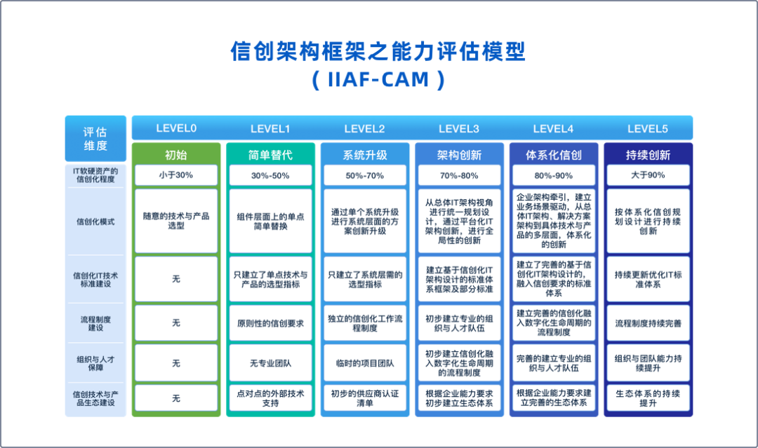 IIAF-CAM 评估模型从企业 IT 软硬件资产的国产化程度、信创化模式、信创化的 IT 技术标准、流程制度、组织与人才保障、信创 IT 技术与产品生态建设 6个方面,确定了 20 多个量化或定性的综合评估指标。