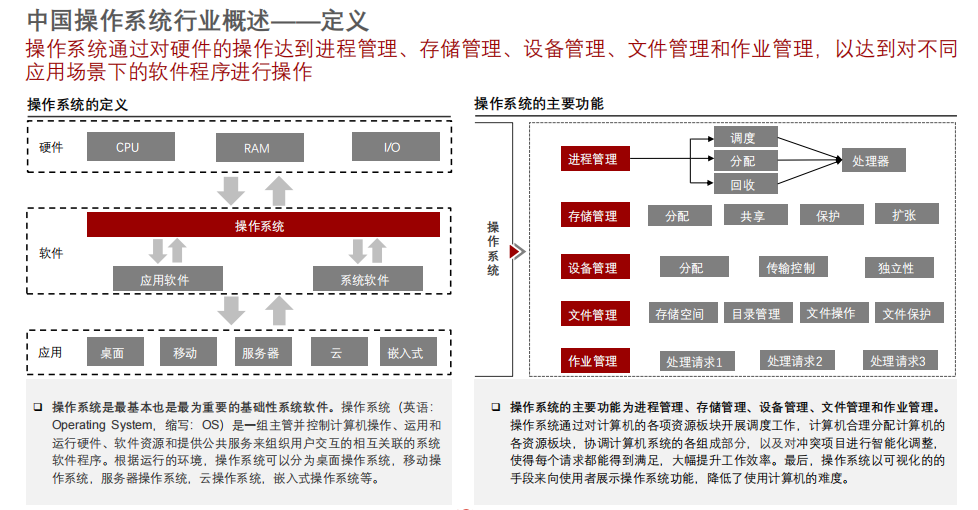 操作系统按照其应用领域可以分为桌面操作系统、服务器操作系统、移动操作系统、云操作系统以及嵌入式操作系统。发展过程中各类操作系统经过沉淀构造生态壁垒,对市场形成垄断。沙利文:中国未来50年产业趋势洞察白皮书