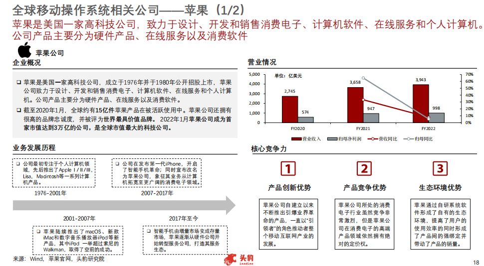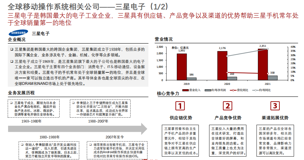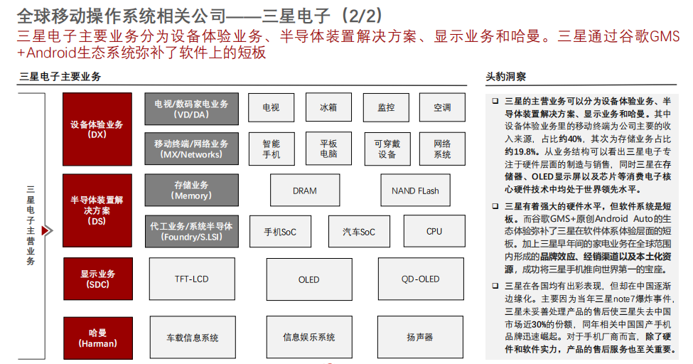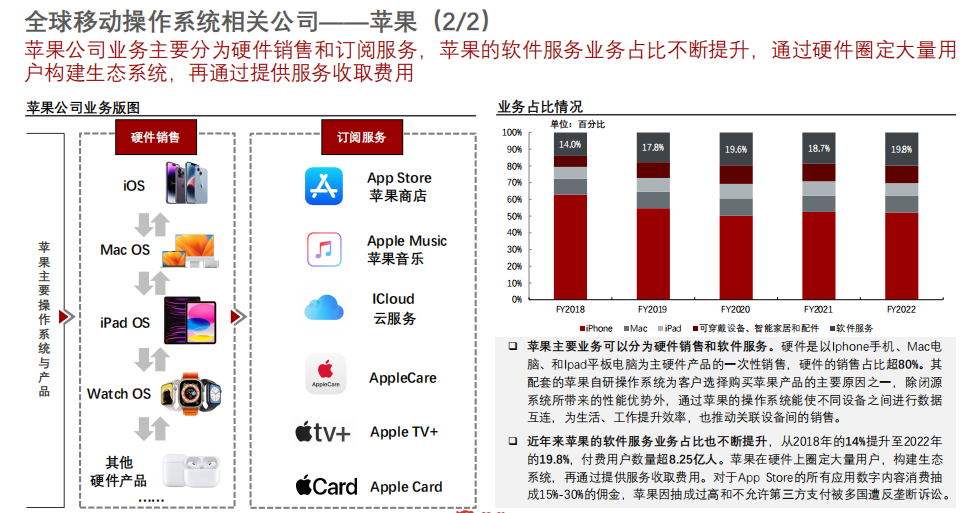 全球移动操作市场被Android和iOS系统所垄断。基于Android的开源特性以及手机与操作系统强绑定助力Android系统垄断市场,iOS以及优异的设计与性能突破重围。搭载OS系统的苹果垄断着高端市场,搭载Android的三星在全价位的销量均处于市场前列,搭载HarmonyOS的华为手机有望在芯片问题解决后抢夺中高端市场份额,差异化和硬件差异是手机市场竞争的关键因素。苹果公司业务主要分为硬件销售和订阅服务,苹果的软件服务业务占比不断提升,苹果通过硬件圈定大量用户构建生态系统,再通过提供服务收取费用;三星具有供应链、产品竞争以及渠道的优势帮助三星手机常年处于全球销量第一的地位。