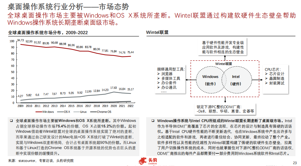 全球桌面操作市场主要被Windows和OS X系统所垄断,Wintel联盟通过构建软硬件生态壁垒帮助Windows操作系统长期垄断桌面级市场。中国服务器市场以开源系统Linux占据绝对领先地位,其中以全面开源的openEuler为主,中国服务器操作系统对成熟、稳定的国产商业版操作系统需求较大。