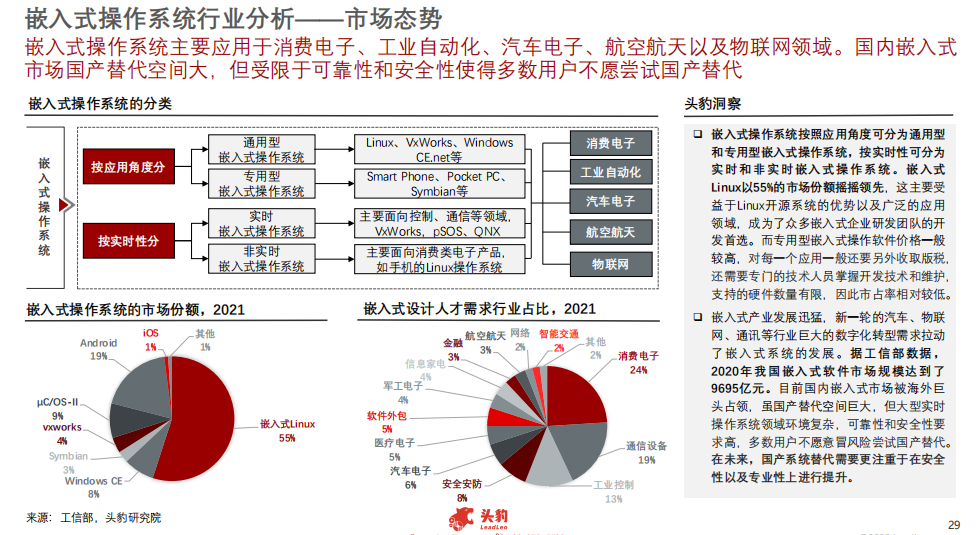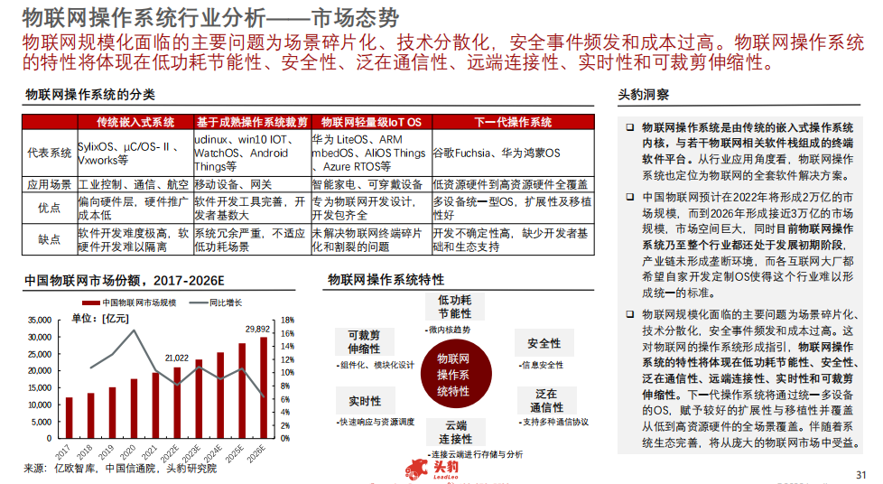 中国市场云计算市场发展迅速,常年保持高速增长且增幅远超全球市场。全球云计算市场被亚马逊所,而亚马逊的核心竞争力体现在自研的软硬件,大大的拉开与传统厂商的性能、性价比差异嵌入式操作系统主要应用于消费电子、工业自动化、汽车电子、航空航天以及物联网领域,国内嵌入式市场国产替代空间大,但受限于可靠性和安全性使得多数用户不愿尝试国产替代。物联网规模化面临的主要问题为场景碎片化、技术分散化,安全事件频发和成本过高。物联网操作系统的特性将体现在低功耗节能性安全性、泛在通信性、远端连接性、实时性和可裁剪伸缩性。推荐阅读: