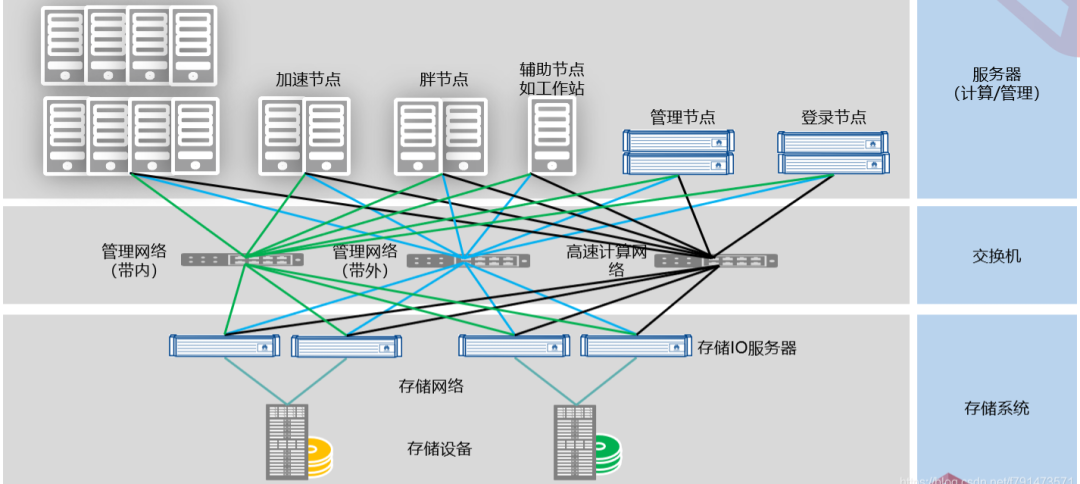 高性能计算拓扑结构,从硬件结构上,高性能计算系统包含计算节点、IO节点、登录节点、管理节点、高速网络、存储系统等组成。
