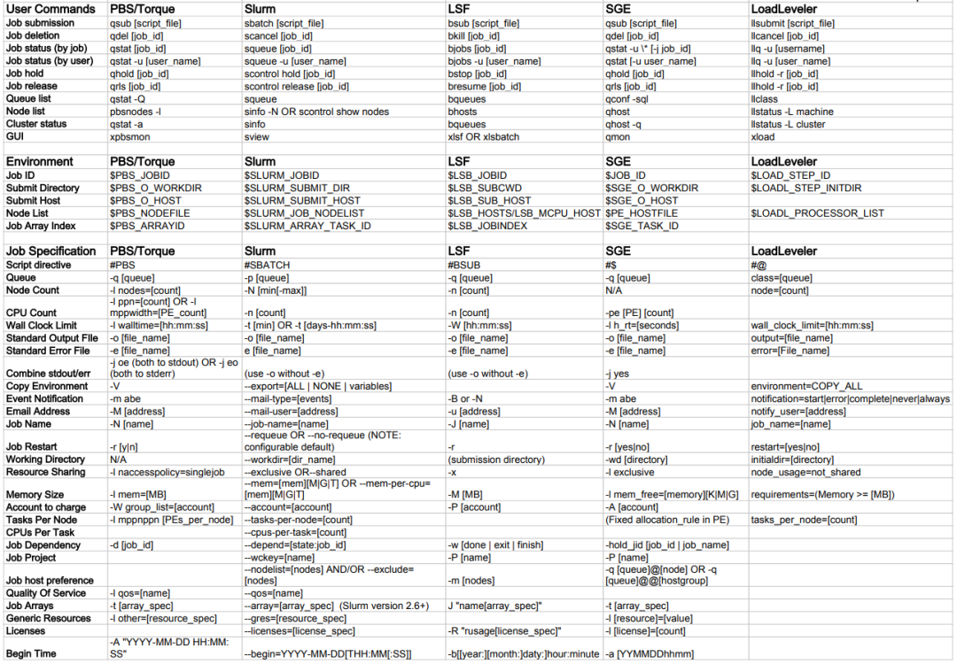 下表列出了目前主要使用的 HPC作业调度管理系统:PBS/Torque、Slurm、LSF、SGE 和 LoadLeveler使用的常用命令、环境变量和作业规范选项,这些作业调度管理器中的每一个都具有独特的功能,但最常用的功能在表中列出的所有这些环境中都可用。