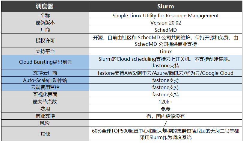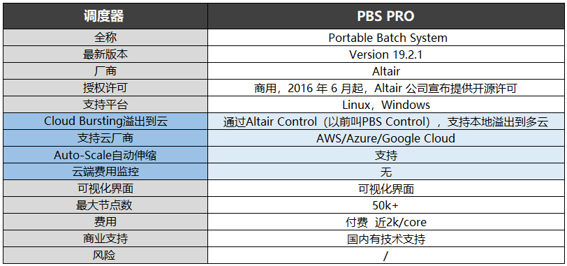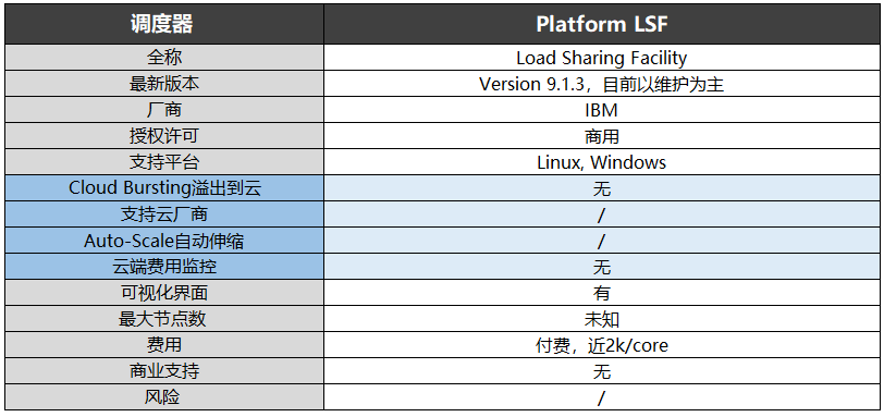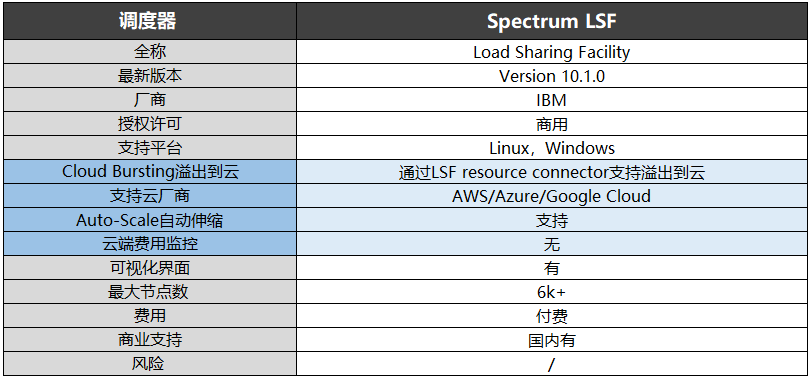 在这三个调度器中,仅有Spectrum LSF支持Auto-Scale集群自动伸缩功能,同时该调度器还可通过LSF resourceconnector实现溢出到云,支持云厂商包括AWS、Azure、Google Cloud。