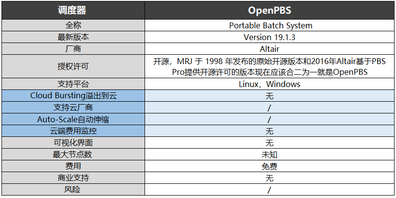 PBS 的主要特点有:代码开放,免费获取;支持批处理、交互式作业和串行、多种并行作业,如 MPI、PVM、HPF、MPL;PBS 是功能最为齐全, 历史最悠久, 支持最广泛的本地集群调度器之一。