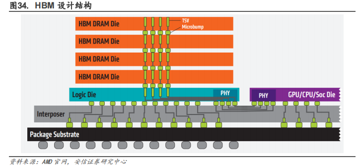 HBM 缓解带宽瓶颈,是 AI 时代不可或缺的关键技术。AI 处理器架构的探讨从学术界开始,当时的模型简单,算力低,后来模型加深,算力需求增加,带宽瓶颈出现,也就是 IO 问题。这个问题可以通过增大片内缓存、优化调度模型等方法解决。但是随着 AI 大模型和云端 AI处理的发展,计算单元剧增,IO 问题更严重了。要解决这个问题需要付出很高的代价(比如增加 DDR 接口通道数量、片内缓存容量、多芯片互联),这便是 HBM 出现的意义。HBM 用晶堆叠技术和硅联通层把处理器和存储器连接起来,把 AI/深度学习完全放到片上,提高集成度,降低功耗,不受芯片引脚数量的限制。HBM 在一定程度上解决了 IO 瓶颈。未来人工智能的数据量、计算量会越来越大,超过现有的 DDR/GDDR 带宽瓶颈,HBM 可能会是唯一的解决方案。