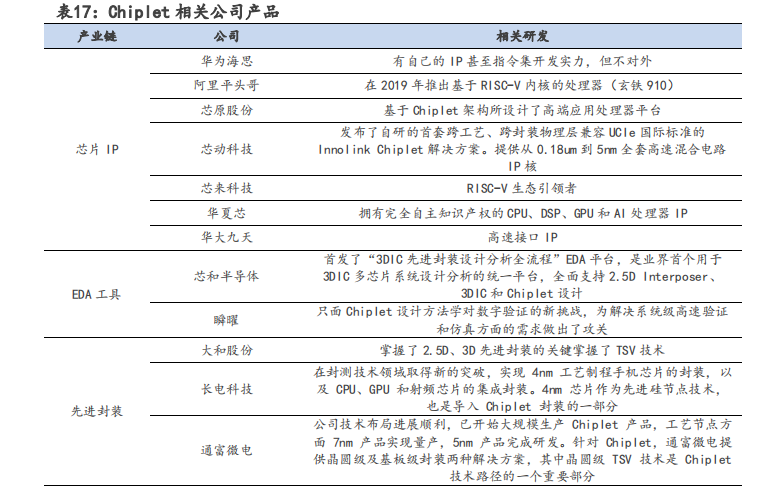 (1)最先受到影响的是芯片 IP 设计企业,Chiplet 本质就是不同的 IP 芯片化,国内类似 IP 商均有望参与其中,比如华为海思有 IP 甚至指令集开发实力的公司,推出基于 RISC-V 内核的处理器(玄铁 910)阿里平头哥半导体公司,独立的第三方 IP 厂商,如芯动科技、芯原股份、芯耀辉、锐成芯微、芯来等众多 IP 公司等。