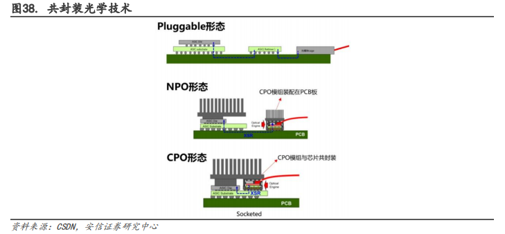 CPO(Co-packaged,共封装光学技术)是高速电信号能够高质量的在交换芯片和光引擎之间传输。在 5G 时代,计算、传输、存储的带宽要求越来越高,同时硅光技术也越来越成熟,因此板上和板间的光互连成为了一种必要的方式。随着通道数大幅增加,需要专用集成电路(ASIC)来控制多个光收发模块。传统的连接方式是 Pluggable(可插拔),即光引擎是可插拔的光模块,通过光纤和 SerDes 通道与网络交换芯片(AISC)连接。之后发展出了 NPO(Near-packaged,近封装光学),一种将光引擎和交换芯片分别装配在同一块 PCB 基板上的方式。而CPO 是一种将交换芯片和光引擎共同装配在同一个 Socketed(插槽)上的方式,形成芯片和模组的共封装,从而降低网络设备的功耗和散热问题。NPO 是 CPO 的过渡阶段,相对容易实现,而 CPO 是最终解决方案。