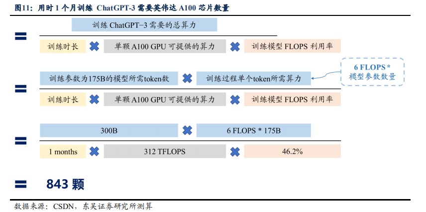 初始训练:根据 openAI 官网数据,每个 token(token 是服务端生成的一串字符串,以作客户端进行请求的一个令牌)的训练成本通常约为 6N FLOPS(FLOPS 指每秒浮点运算次数,理解为计算速度,可以用来衡量硬件的性能),其中 N 是 LLM(大型语言模型)的参数数量。1750 亿参数模型的 GPT-3 是在 3000 亿 token 上进行训练的。根据openAI 官网数据,在训练过程中,模型的 FLOPS 利用率为 46.2%。我们假设训练时间为 1 个月,采用英伟达 A100 进行训练计算(峰值计算能力为 312 TFLOPS FP16/FP32),则测算结果为需要 843 颗英伟达 A100 芯片。