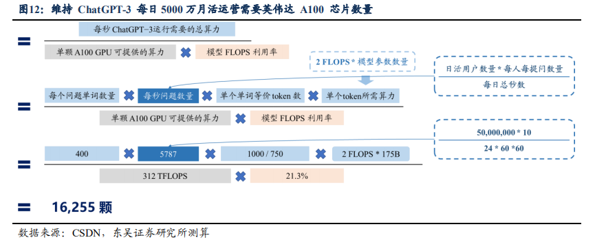 运营(推理)成本:运营阶段所需算力量与使用者数量紧密相关。根据 openAI 官网数据,每个token 的推理成本通常约为 2N FLOPS,其中 N 是 LLM 的参数数量。根据openAI 官网数据,在训练过程中,模型的 FLOPS 利用率为 21.3%。同样采用英伟达 A100进行推理计算(峰值计算能力为 312 TFLOPS FP16/FP32)。我们假设 GPT-3 每日 5000万活跃用户,每个用户提 10 个问题,每个问题回答 400 字,则测算结果为需要 16255颗英伟达 A100 芯片。