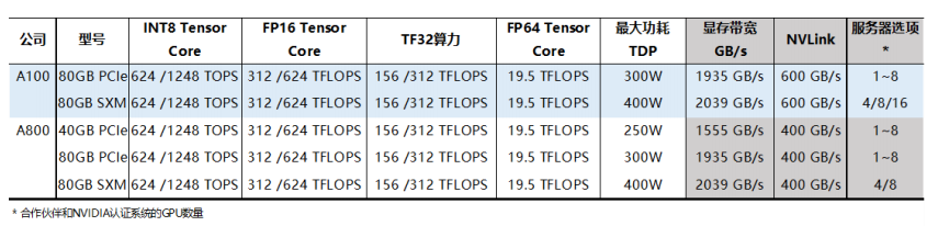 英伟达推出中国特供版 A800,算力与 A100 基本一致。2022 年 11 月 8 日,英伟达推出 A800 GPU,将是面向中国客户的 A100 GPU 的替代产品。A800 符合美国政府关于减少出口管制的明确测试,并且不能通过编程来超过它。A800 GPU 在算力上与 A100 保持一致,但增加了 40GB显存的 PCIe 版本,但在 NVLink 互联速度上,A800 相较于A100 下降了 200GB/s 的速度。同时,A800 80GB SXM 版本目前已经不支持 16 块 GPU的成套系统,上限被限制在 8 块。总的来看,A800 能够满足国内市场需求,是 A100 的平替版本。