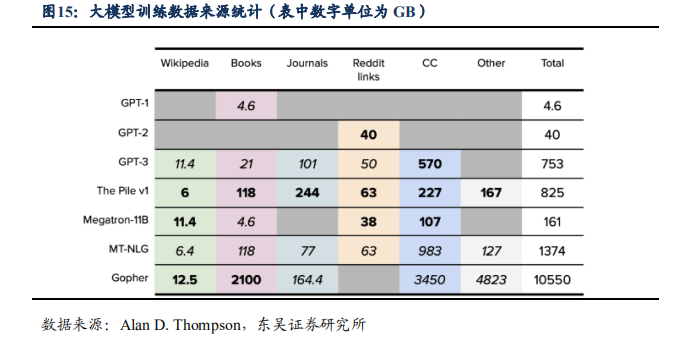 大模型的训练数据主要来自于维基百科、书籍、期刊、Reddit 社交新闻站点、Common Crawl和其他数据集。OpenAI 虽没有直接公开 ChatGPT 的相关训练数据来源和细节,但可以从近些年业界公布过的其他大模型的训练数据推测出 ChatGPT 的训练数据来源,近几年大模型训练采用的数据来源基本类似。国内大模型的数据来源和自身优势业务有较强相关性,如百度文心一言大模型的来源主要基于互联网公开数据,包括网页、搜索、图片、语音日均调用数据,以及知识图谱等。