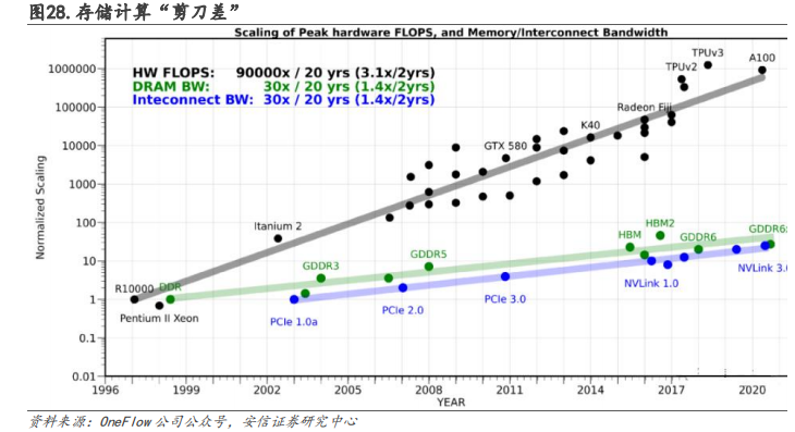 “存”“算”性能失配,内存墙导致访存时延高,效率低。内存墙,指内存的容量或传输带宽有限而严重限制 CPU 性能发挥的现象。内存的性能指标主要有“带宽”(Bandwidth)和“等待时间”(Latency)。近 20 年间,运算设备的算力提高了 90000 倍,提升非常快。虽然存储器从 DDR 发展到 GDDR6x,能够用于显卡、游戏终端和高性能运算,接口标准也从 PCIe1.0a 升级到 NVLink3.0,但是通讯带宽的增长只有 30 倍,和算力相比提高幅度非常缓慢。