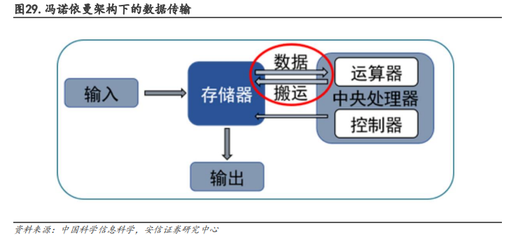 冯诺依曼架构下,数据传输导致严重的功耗损失。冯·诺依曼架构要求数据在存储器单元和处理单元之间不断地“读写”,这样数据在两者之间来回传输就会消耗很多的传输功耗。根据英特尔的研究表明,当半导体工艺达到 7nm 时,数据搬运功耗高达 35pJ/bit,占总功耗的63.7%。数据传输造成的功耗损失越来越严重,限制了芯片发展的速度和效率,形成了“功耗墙”问题。