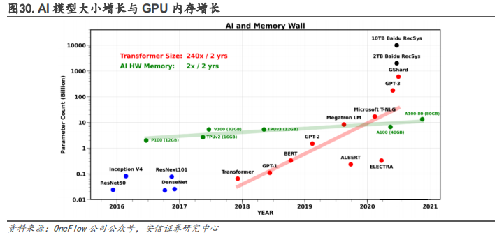 AI 模型参数量极速扩大,GPU 内存增长速度捉襟见肘。在 GPT-2 之前的模型时代,GPU 内存还能满足 AI 大模型的需求。近年来,随着 Transformer 模型的大规模发展和应用,模型大小每两年平均增长了 240 倍。GPT-3 等大模型的参数增长已经超过了 GPU 内存的增长。传统的设计趋势已经不适应当前的需求,芯片内部、芯片之间或 AI 加速器之间的通信成为了 AI训练的瓶颈。AI 训练不可避免地遇到了“内存墙”问题。