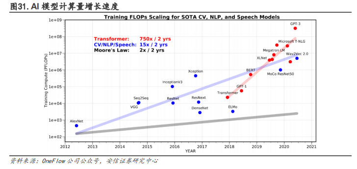 AI 模型运算量增长速度不断加快,推动硬件算力增长。预训练技术的进步导致了各领域模型计算量的快速增长,大约每两年就要增加 15 倍。而 Transformer 类模型的运算量更是每两年就要增加 750 倍。这种近乎指数的增长趋势促使 AI 硬件的研发方向发生变化,需要更高的峰值算力。
