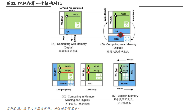 存内逻辑:通过在内部存储中添加计算逻辑,直接在内部存储执行数据计算。典型代表包括 TSMC(在 2021 ISSCC 发表论文)和千芯科技。