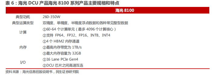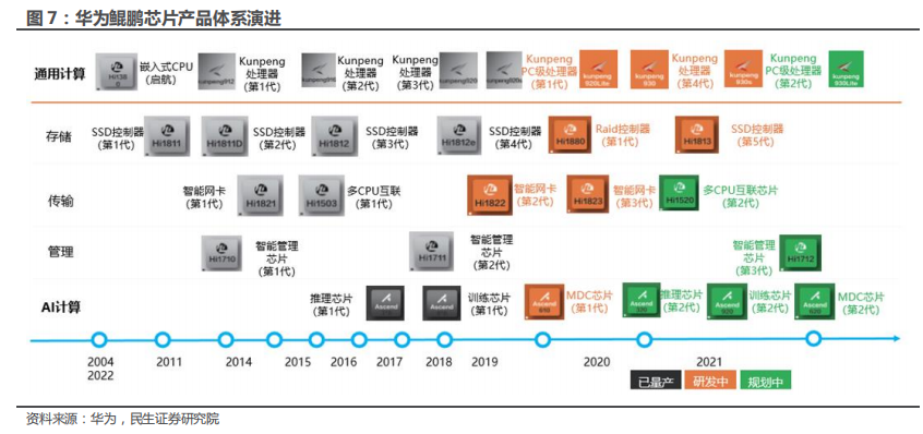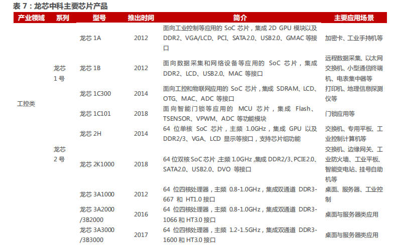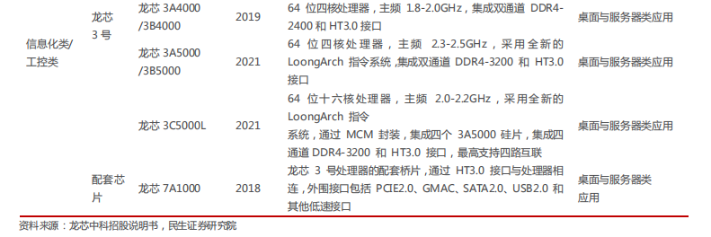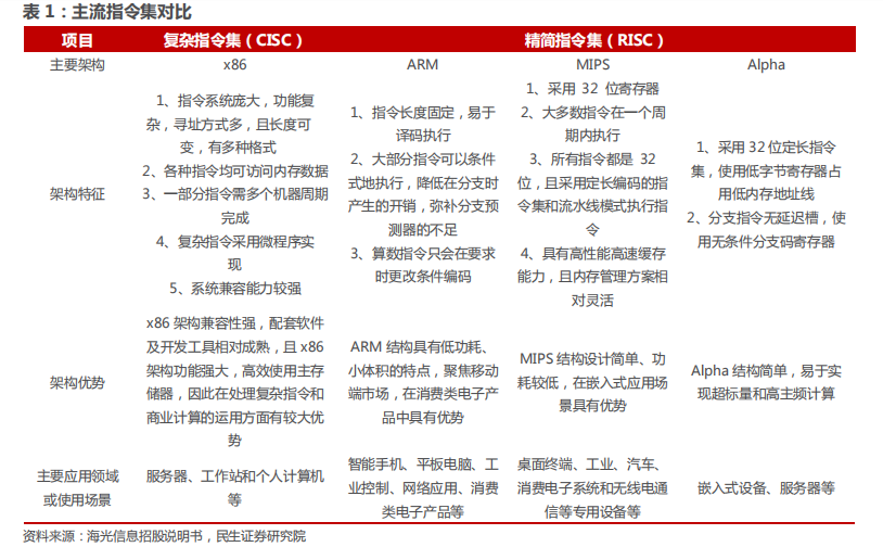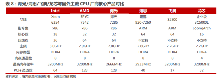 其中,复杂指集指令丰富、寻址方式灵活,以微程序控制器为核心,指令长度可变,功能强大,复杂程序执行效率高;精简指令集指令结构简单、易于设计,具有较高的执行能效比。在现行主流指令集架构中,x86 架构是复杂指令集的代表,而 ARM 架构、MIPS 架构和 Alpha 架构等是精简指令集的代表。CPU 是支撑数字底座生态架构发展的基础,也是决定信创底层发展逻辑的关键所在。国产 CPU 群雄逐鹿,各显“神通”。华为鲲鹏在国产 CPU 中目前具备最完善的生态体系与商业化环境,自上而下全栈式打造鲲鹏计算产业。海光 CPU 基于成熟的 x86 指令框架,“类 CUDA”计算环境和国际先进处理器设计技术,海光同时拥有海光 CPU 和海光 DCU 两类高端处理器产品,可以满足服务器、工作站等计算、存储设备中对高端处理器的功能需求,是目前适配难度最低、通用型较强的国产化 CPU 厂商;飞腾 CPU 与 麒麟操作系统构筑国产底座“PK”体系,是基础生态体系最全面的“国家队”。中科龙芯引进消化吸收 MIPS,推出了自主指令系统 LoongArch,是底层自主化程度最高的国产化 CPU 厂商。芯片为信创产业根本硬件基础,重要性凸显。不同于其他产业,IT 基础设施国产化存在显著的“木桶效应”,在“硬件—软件—服务”链条中任何环节的国产化能力缺失将造成整个自主体系发展的停滞。芯片作为整个 IT 生态最底层的基础硬件,为整个计算机体系提供算力支撑,通过与上层的操作系统紧密配合,实现系统软硬件的基础调度、控制与资源支持,是整个国产化信创体系的中枢大脑,是我国软硬件国产化的根本。基于 ARM 架构开发,是华为继移动麒麟芯片、AI 昇腾芯片后,第三款自研芯片。鲲鹏芯片定位于服务器应用,其产品自研完成了华为具备优势的服务器业务自上而下的基础算力打通。在通用计算处理器领域,2014 年发布鲲鹏 912 处理器, 2016 年发布鲲鹏 916处理器。2019 年 1 月,华为正式发布鲲鹏 920 芯片。根据华为官方介绍,鲲鹏 920 处理器是业界第一颗采用 7nm 工艺的数据中心级的 ARM 架构处理器,集成最多 64*自研核,支持 64 核、48 核、32 核等多种型号。华为将鲲鹏芯片用于自身服务器,并用来搭建自身的数据中心业务。鲲鹏芯片多向出击,鲲鹏 930 芯片值得期待。华为鲲鹏处理器是华为自主研发的基于 ARM架构的企业级系列处理器产品,包含“算、存、传、管、智”五个产品系统体系。为了保证鲲鹏计算产业的可持续演进,鲲鹏处理器从指令集和微架构两方面进行兼容性设计,确保既可以适应未来的应用和技术发展演进的需求,又能后向兼容。参考华为鲲鹏芯片的发展路径规划,鲲鹏次时代芯片 930 芯片将有望进一步迭代,并在服务器和 PC 两个方向进一步出击。TaiShan 200 服务器是华为新一代数据中心服务器,基于华为鲲鹏 920 处理器,适合为大数据、分布式存储、原生应用、高性能计算和数据库等应用高效加速,旨在满足数据中心多样性计算、绿色计算的需求。TaiShan 200 服务器仅为华为基于鲲鹏芯片所打造的自有服务器产品,鲲鹏通用计算平台事实上提供基于鲲鹏处理器的TaiShan 服务器、鲲鹏主板及开发套件。2、基于海外龙头加快自主研发,发出国产 x86 体系最强音拥有海光CPU和海光DCU两类高端处理器产品,可以满足服务器、工作站等计算、存储设备中对高端处理器的功能需求:海光 CPU:兼容 x86 指令集,处理器性能参数与国际同类型主流处理器产品相当,支持国内外主流操作系统、数据库、虚拟化平台或云计算平台,能够有效兼容目前存在的数百万款基于 x86 指令集的系统软件和应用软件,具有优异的生态系统优势。此外,海光 CPU 支持国密算法,扩充了安全算法指令,集成了安全算法专用加速电路,支持可信计算,提升了高端处理器的安全性。从海光 CPU 应用场景角度看,公司将海光 CPU 产品规划为海光 7000 系列、海光 5000 系列和海光 3000 系列。三个系列产品技术设计同源,处理器核心等具有相似的技术特征。根据不同的产品规格定义,需要在一块基板上封装 1 至 4颗裸片。目前,公司在售的海光 CPU 产品主要为海光 7200、海光 5200 和海光 3200 系列产品。海光 DCU:以 GPGPU 架构为基础,兼容“类 CUDA”环境,软硬件生态丰富,典型应用场景下性能指标达到国际上同类型高端产品的水平。海光 DCU 主要面向大数据处理、商业计算等计算密集型应用领域,以及人工智能、泛人工智能类运算加速领域。海光 DCU 产品采用与海光 CPU 类似的产品研发策略,2018 年1 月启动深算一号 DC 产品设计,目前品已实现商业化应用。另一方面,公司启动了第二代 DCU 深算二号的产品研发工作已于 2020 年 1 月启动。海光 CPU 系列产品中海光一号、海光二号已经实现商业化应用,海光三号完成实验室验证,海光四号处于研发阶段;海光 DCU 系列产品深算一号已经实现商业化应用,深算二号处于研发阶段。目前主要包括高性能服务器 CPU(飞腾腾云 S 系列)、高效能桌面 CPU(飞腾腾锐 D 系列)、高端嵌入式 CPU(飞腾腾珑 E 系列)和飞腾套片四大系列,为从端到云的各型设备提供核心算力支撑。基于飞腾 CPU 的产品覆盖多种类型的终端(台式机、一体机、便携机、瘦客户机等)、服务器和工业控制嵌入式产品等,在国内政务办公、云计算、大数据以及金融、能源和轨道交通等行业信息系统领域已实现批量应用。前两代飞腾芯片均停留在学术层面,均采用仿
