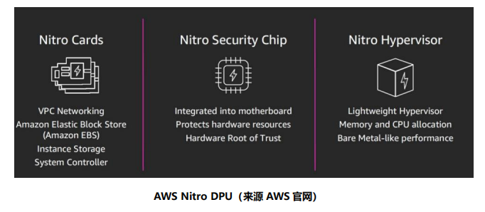 AWS 是全球领先的云计算服务和解决方案提供商,AWS Nitro DPU 系统已经成为了AWS 云服务的技术基石。AWS 借助 Nitro DPU 系统把网络、存储、安全和监控等功能分解并转移到专用的硬件和软件上,将服务器上几乎所有资源都提供给服务实例,极大地降低了成本。