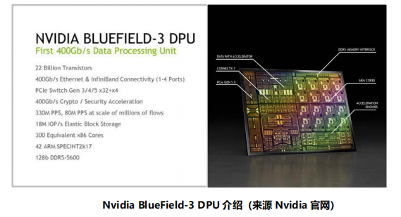 Nvidia BlueField-3 DPU 延续了 BlueField-2 DPU 的先进特性,是首款为 AI 和加速计算而设计的 DPU。BlueField-3 DPU 提供了最高 400Gbps 网络连接,可以卸载、加速和隔离软件定义网络、存储、安全和管控功能,从而提高数据中心性能、效率和安全性。
