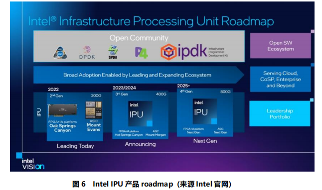 2021年,Intel在Intel Architecture Day上发布了Oak Springs Canyon 和 Mount Evans IPU 产品。其中,Oak Springs Canyon 是基于 FPGA 的 IPU 产品,Mount Evans IPU是基于 ASIC 的 IPU 产品。
