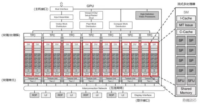 图 3-1 流式多处理器在GPU架构中的位置(以NVIDIA Tesla架构为例,修改自NVIDIA)