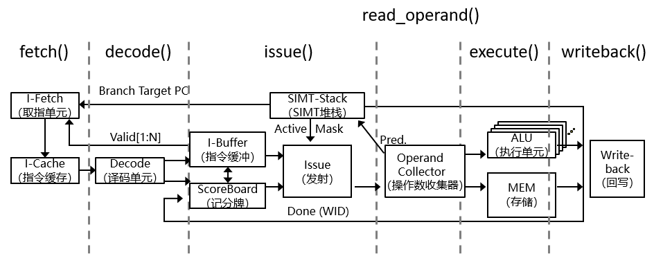 译码单元(Decode):将指令解码并转发至I-Buffer。该单元还将源和目标寄存器信息转发到记分牌,并将指令类型、目标地址(用于分支)和其他控制流相关信息转发到 SIMT 堆栈。