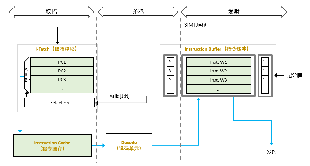 在(译码后的)指令发射阶段,指令循环仲裁选择一个Warp,将I-Buffer中的发射到流水线的后级,且每个周期可从同一Warp发射多条指令。