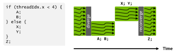 SIMT 掩码可以解决Warp内分支执行问题,通过串行执行完毕分支之后,线程在Reconverge Point(重合点)又重新聚合在一起以便最大提高其并行能力。