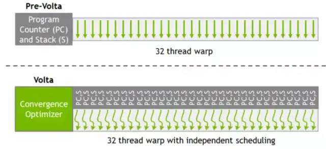 NVIDIA为V100 中Warp内的每个线程都分配了一个PC指针和堆栈,将PC指针的颗粒度细化到每一个线程中去,保障数据交换避免死锁。(图3-5)