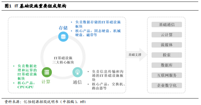 2022-2025 年数据中心存储市场收入规模复合增速预计实现 5.89%,超过数据中心市场整体复合增速5.01%。2025 年,全球 SSD 市场规模将达到 255.1 亿美元,其中国内企业级固态硬盘市场规模将增至 489 亿元,5 年间复合增速约25%,其中 PCIe 固态硬盘市场份额比例将从 2020 年 59%增至 90%。近年来,中国大陆厂商积极发力 PCIe 3.0、PCIe4.0 甚至更高端的 PCIe 5.0 企业级 SSD,整体实力不断提升,同时我国上下游企业出海,助力企业级存储国产化迈向新阶段。2021年,国内 SSD 主控芯片厂商全球出货量占比 10.33%,替代空间广阔。存储是 IT 基础设施的重要组成部分,是数字经济的底座。IT 基础设施总体分为计算、存储和通信三大板块,分别以处理器、存储器、交换机/路由器等为核心产品。