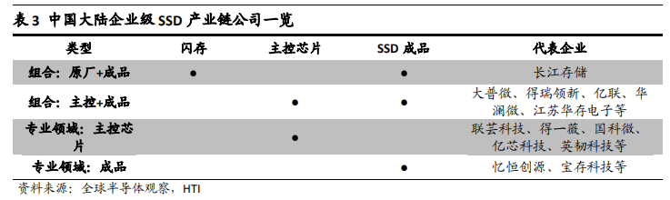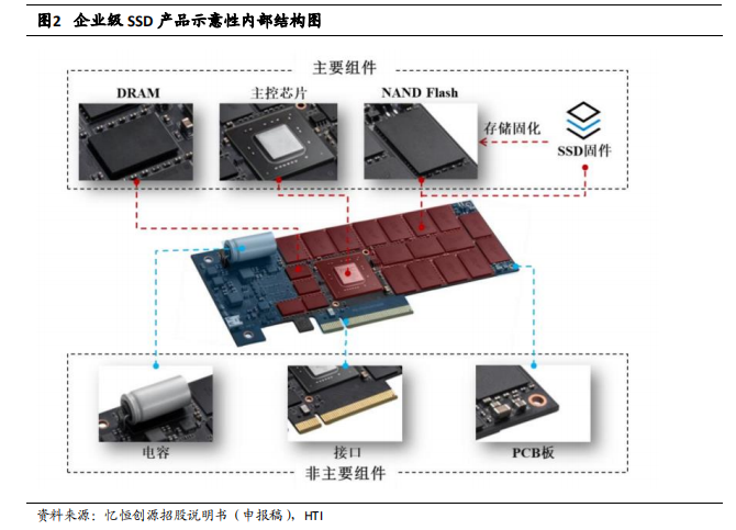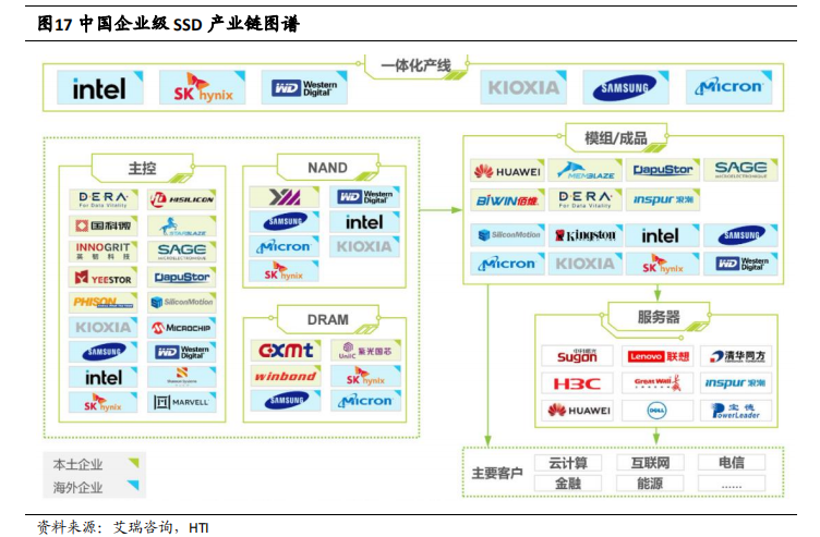 从企业级 SSD 产业链出发,目前市场的业务布局模式包括:能够一体化完成固态硬盘全部生产线的企业(如三星)、专注于固态硬盘 NAND 生产的企业(如长江存储)、专注于主控领域的企业(如英韧科技)、专注于模组生产研发的企业(如忆恒创源)、专注于控制器和模块组合生产研发的企业(如赛捷)、专注于 SSD 成品的企业(如宝存科技)以及同时包括控制器、模组和服务器研发生产,业务向下游延伸的企业(如华为)。企业级 SSD 的主要硬件组件包括 NAND Flash、主控芯片和 DRAM, 核心软件为企业级 SSD 的固件。