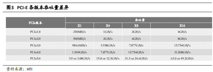 目前 SATA 和 PCIe 是 SSD 产品两种主要的总线标准,部分使用 SAS。不同总线标准的位宽和传输频率决定了每次传输中能够提供的最大速度,其中 PCIe 具备更好的带宽速度,因而SATA 接口+AHCI 协议被 PCIe 接口+NVMe 协议逐步取代。PCIe 从 1.0 到 4.0 版本的吞吐量具有质的飞跃,PCIe 4.0 是目前大规模商用较为主流的版本,SSD 性能大幅提升,但相较于 PCIe 3.0SSD,价格仍高出很多,将率先在高端市场应用。当前 PCIe SSD 主要还是以 PCIe 3.0x4 为主,最大理论速度可以达到 4GB/s,一般 SSD 最大实际测试速度基本可以达到 3.5GB/s。PCIe 4.0 相较于 PCIe 3.0,最大带宽翻倍,PCIe 4.0 x4 通道可带来 8GB/s 的超高理论带宽,SSD 实测顺序读取性能也能达到 7GB/s。PCIe 5.0 在企业级和消费级都已有产品产出,头部主控厂商 Marvell 企业级 SSD 及原厂 Intel 第 12 代处理器均有搭载。