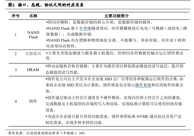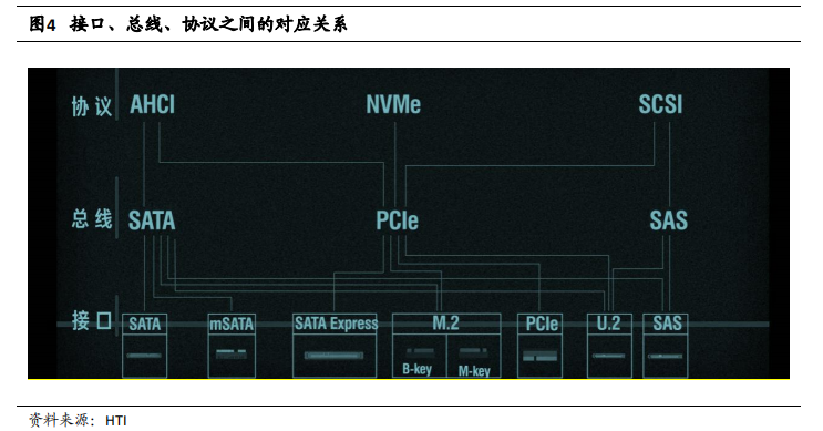 按照不同应用场景,SSD 可以分为消费级、企业级和军工级产品。消费级 SSD广泛应用于电脑设备、移动终端、商业电子、车载应用及智能穿戴等场合,企业级SSD 主要面向互联网、企业数据中心、服务器、云计算等企业级用户,与消费级 SSD相比,企业级 SSD 需要具备更快传输速度、更大单盘容量、更高使用寿命以及更高的可靠性要求。而实际应用需求的不同导致了消费级 SSD 和企业级 SSD 在协议、总线和接口选择上的差异性。固态硬盘的性能以高速传输数据的协议为支撑,同时总线和接口能够承载协议的性能,三者均是限制固态硬盘性能发挥的因素。1、接口