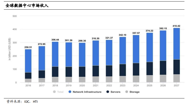 存储作为云计算基础设施产业链重要环节,未来收入规模复合增速有望领先市场。根据 Statista 预测,2022 年数据中心市场的收入将达到 3210.4 亿美元,2016-2022 年市场收入复合增速为 4.24%;而未来 5 年数据中心市场将继续保持稳定增长,2027 年有望达到 4104 亿美元,2022-2027 年市场规模复合增速达到 5.01%。其中,存储市场收入未来复合增速将超过数据中心整体市场。2022 年数据中心存储市场收入规模为 447 亿美元,2027 年将达到 595.2 亿美元,复合增速实现 5.89%。