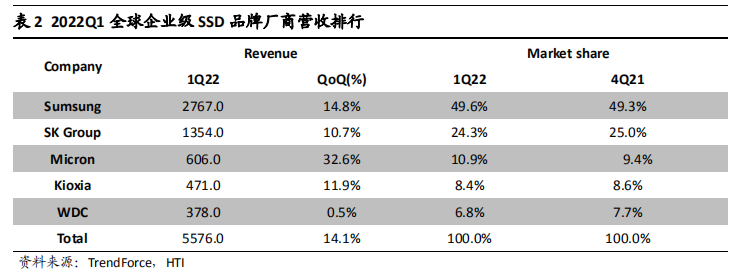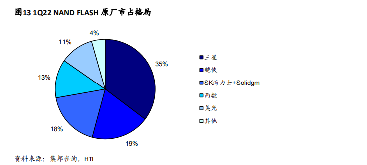 这五家厂商也同样是全球前五大闪存巨头,NAND Flash 合计市占率高达95.6%。除了生产 NAND Flash 闪存颗粒,原厂还自行研发主控芯片以及生产企业级SSD 成品,其产品具备较强技术优势。