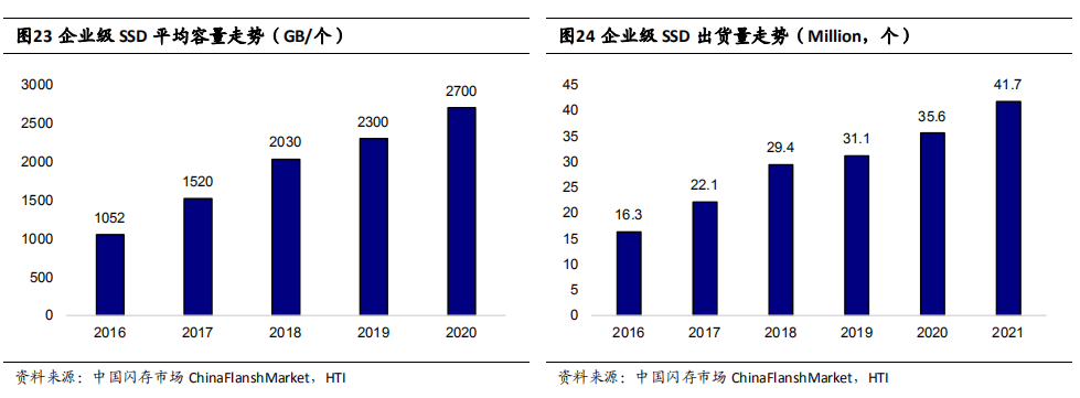 21世纪前,固态硬盘技术和商业化的探索主要集中在美、日、韩等国,领先企业包括美国的 Intel、西数,日本的东芝、日立以及韩国的三星、海力士等。21 世纪前 10 年是全球存储行业龙头加速布局的时期,Intel、三星等在 2010 年前后陆续进入中国市场,2017 年后随着 3D-NAND 技术的进一步成熟以及国内互联网经济蓬勃发展,(企业级)固态硬盘行业进入繁荣期。2013 年之前“中国制造”是国内存储产业的主要运营模式,2014 年后国内半导体产业在国家政策的支持下加速发展,在主控、闪存等产业链环节逐步实现对国外供应商的替代,从产品性能和产能方面追赶国际领先。回顾 2021 年 SSD 的主控市场,全球 SSD 主控芯片出货量为 4.19 亿颗,较 2020年 3.85 亿颗,年度增长 8.83%。在云计算、数字经济等需求的带动下,服务器市场不断扩张,随之带来的是 SSD 越来越受到欢迎。
