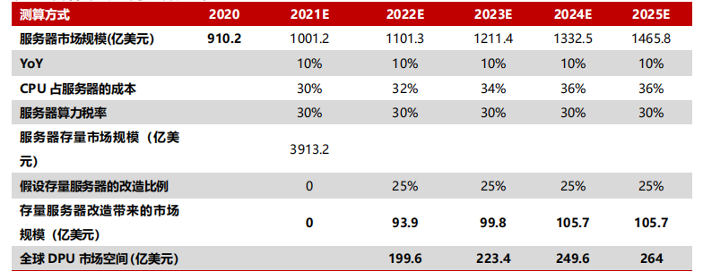 1)增量市场:按照数据中心税当前为 30%计算,当前 DPU 市场潜在规模为 CPU 在服务器市场中市场规模的 30%。根据这一思路,测算出 DPU的潜在市场规模。2)存量市场:由于服务器生命周期为 3-5 年,按照原有服务器假设 21-25 年仍以 10%的复合增速保持增长,则 21-25 年全球改造比例为 25%分四年改造完成。根据海光信息招股说明书,16-20 年五年一个周期,全球服务器存量市场规模为 3913.2 亿美元。3)整体来看:总体 DPU 市场规模(亿美元)=(服务器市场规模+存量服务器市场规模*改造比例)*CPU 占服务器的成本*服务器算力税率;计算得出 2025 年全球 DPU 市场空间为 264 亿美元。根据赛迪顾问数据,2020 年全球 DPU 产业市场规模达 30.5 亿美元,据方法一测算,至 2025年,市场空间将有望达到约 264 亿美元,期间 CAGR 为 54.0%。